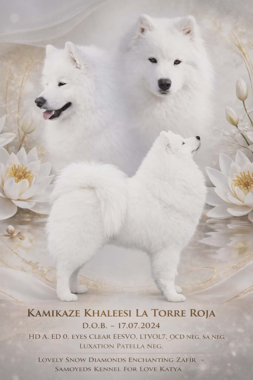 MOM: SAMOYEDS KENNEL FOR LOVE KATYA "KATY" D.O.B- 10.10.2018- HD- A, ED- 00, XL-PRA neg, eyes clear PUPPY CH SR, JCH SR, JCH ČR, JCH KSP ČR, III. Best Female SKCZ 2019 Best Junior Female SKS 2019, BIS Puppy, III.BIS Puppy, BIS JUNIOR, Res.BIS JUNIOR (SAMOYEDS KENNEL FOR LOVE ELVIS & SAMOYEDS KENNEL FOR LOVE GENIFFER).